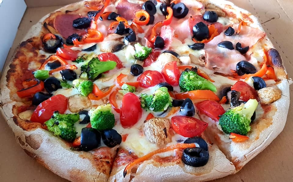 550g- blat cu maia 300g, sos de rosii 50g, mozzarella 200g, broccoli, ardei, ceapa, ciuperci 30g, masline 20g