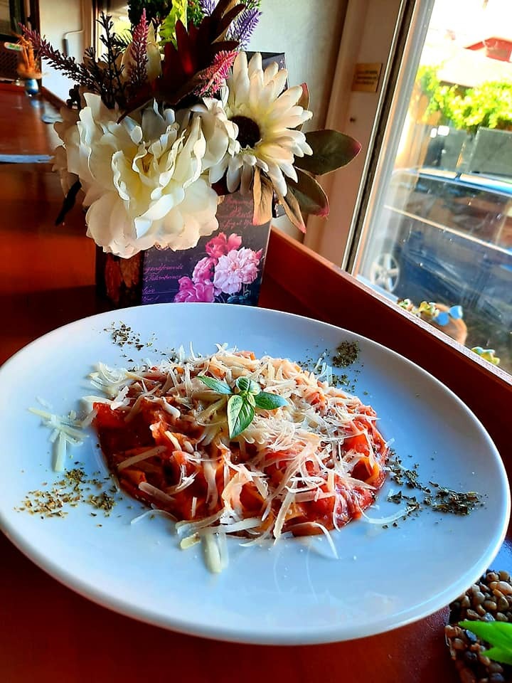 Torteloni cu ragu hand made 130g , sos rosu 100g, busuioc, oregano, mozarella 70g, grana padano 40g.